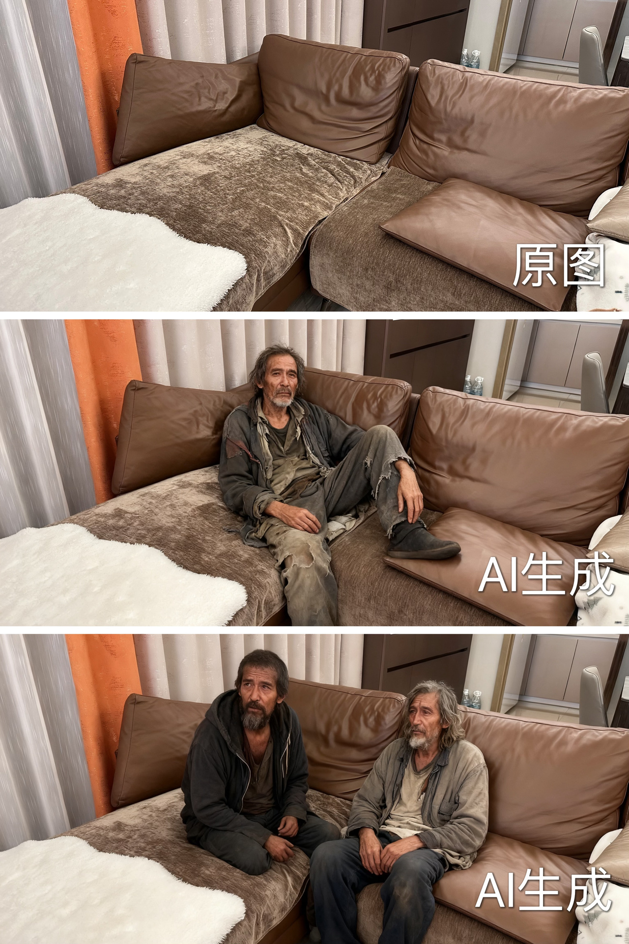 记者尝试用某知名AI软件进行实测。先拍摄一张自家客厅沙发的照片,将照片上传到该软件中,随后输入一段指令性提示词:把一名流浪汉P到沙发上坐着。随后AI自动补充了画幅比例、高品质等常见指令。点击生成按钮,经过10秒,流浪汉坐在记者家沙发上的照片便出现在眼前。AI还给出了两种不同选择:一张是一名流浪汉单脚踩在沙发上,目光盯着镜头;另一张,有两名流浪汉坐在沙发上看电视。