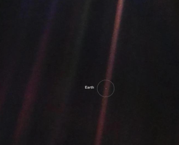 “我们成功地拍摄了这张照片,当你看它,会看到一个小点。那就是这里,那就是家园,那就是我们。你所爱的每个人,认识的每个人,听说过的每个人,历史上的每个人,都在它上面活过了一生。
