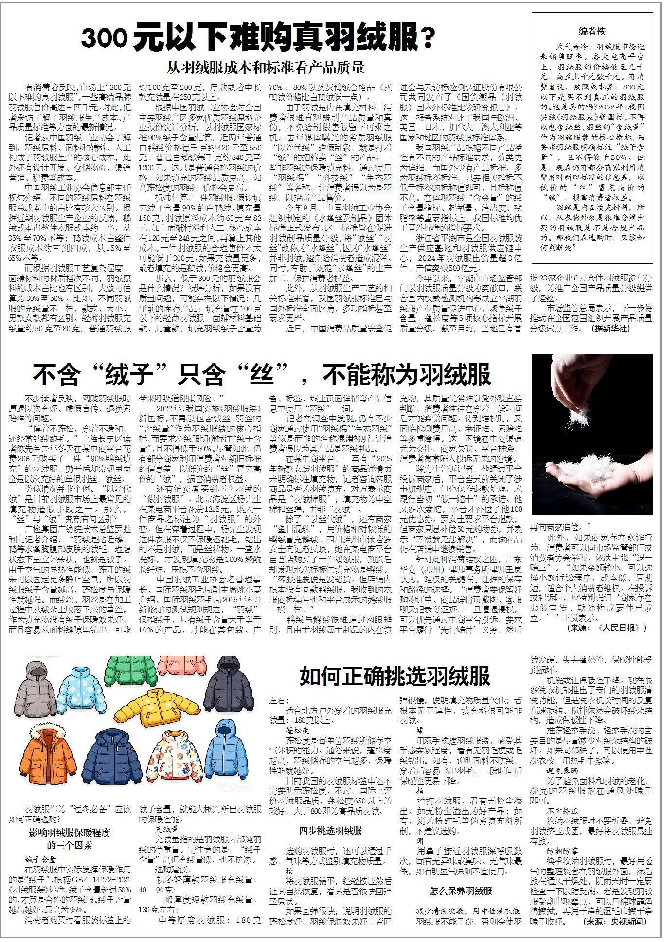 天气转冷,羽绒服市场迎来销售旺季。各大电商平台上,羽绒服的价格低至几十元,高至上千元数千元。有消费者说,按照成本算,300元以下是买不到真正的羽绒服的。这是真的吗?2022年,我国实施《羽绒服装》新国标,不再以包含绒丝、羽丝的“含绒量”作为羽绒服装的核心指标,而要求羽绒服明确标注“绒子含量”,且不得低于50%。但是,现在仍有部分商家利用消费者对新旧标准的信息差,以低价的“丝”冒充高价的“绒”,损害消费者权益。