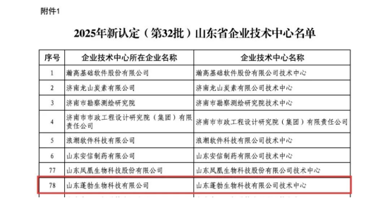 近日,山东省发展和改革委员会公布《2025年新认定(第32批)山东省企业技术中心名单》,山东蓬勃生物科技有限公司凭借过硬的研发实力与创新能力成功入选,标志着该公司科技创新平台建设迈入新阶段。