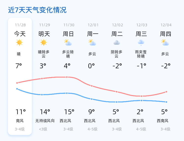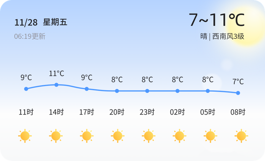 今日是2025年11月28日,星期五,农历十月初九。烟台市今日天气晴朗,气温在7℃至11℃之间,西南风3级,空气湿度为55%,PM2.5指数为26。各区天气情况基本一致,均为晴朗天气,适合户外活动。