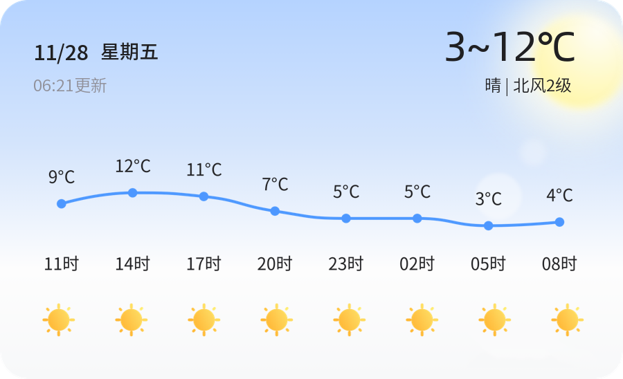 今天是2025年11月28日,农历十月初九,星期五。泰安市今日天气晴朗,北风2级,空气湿度40%,PM2.5指数为101,空气质量为轻度污染。目前温度为2摄氏度,预计今日最高气温12摄氏度,最低气温3摄氏度。早晨气温较低,市民出行时请注意保暖,建议佩戴口罩以应对空气质量问题。中午至下午,天气适宜外出活动,但需注意防晒和保暖。未来三天天气趋势明日泰安市将继续保持晴朗天气,气温将有所上升,最高气温可达17摄氏度,最低气温2摄氏度。后日天气多云转晴,气温有所下降,最高气温15摄氏度,最低气温-2摄氏度。接下来的三天内,泰安市气温波动较大,市民需根据天气变化及时调整衣物,特别注意夜间和早晨的低温,以免受凉。温馨提示