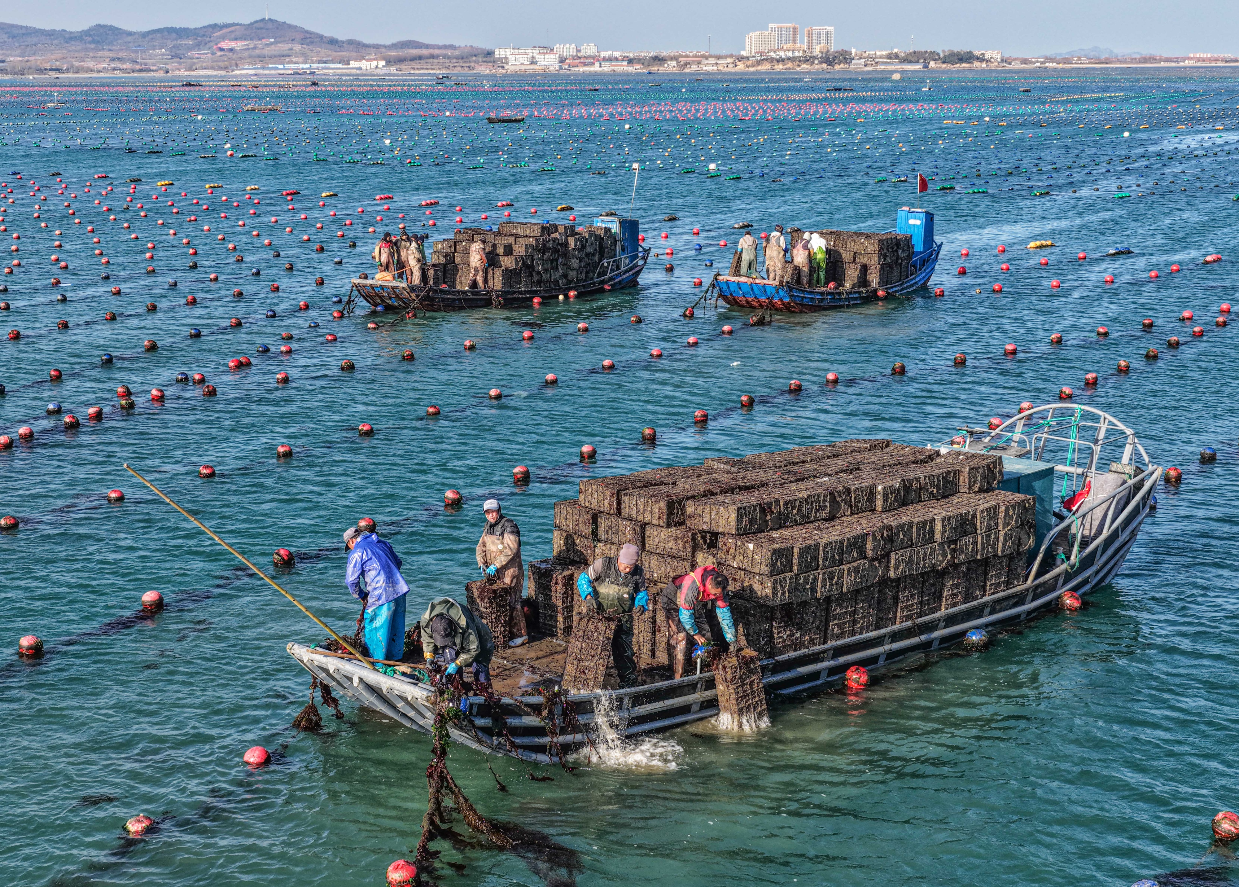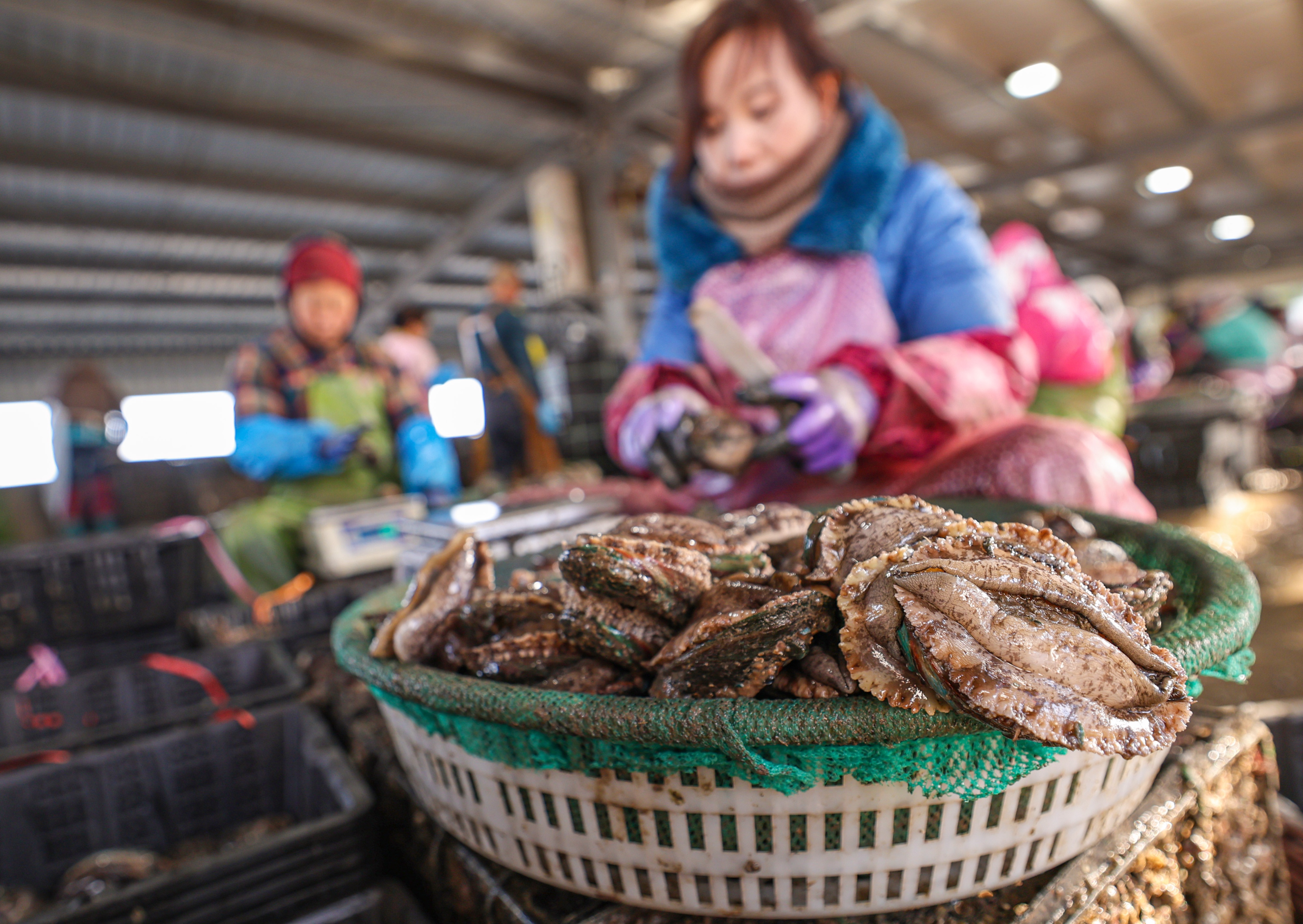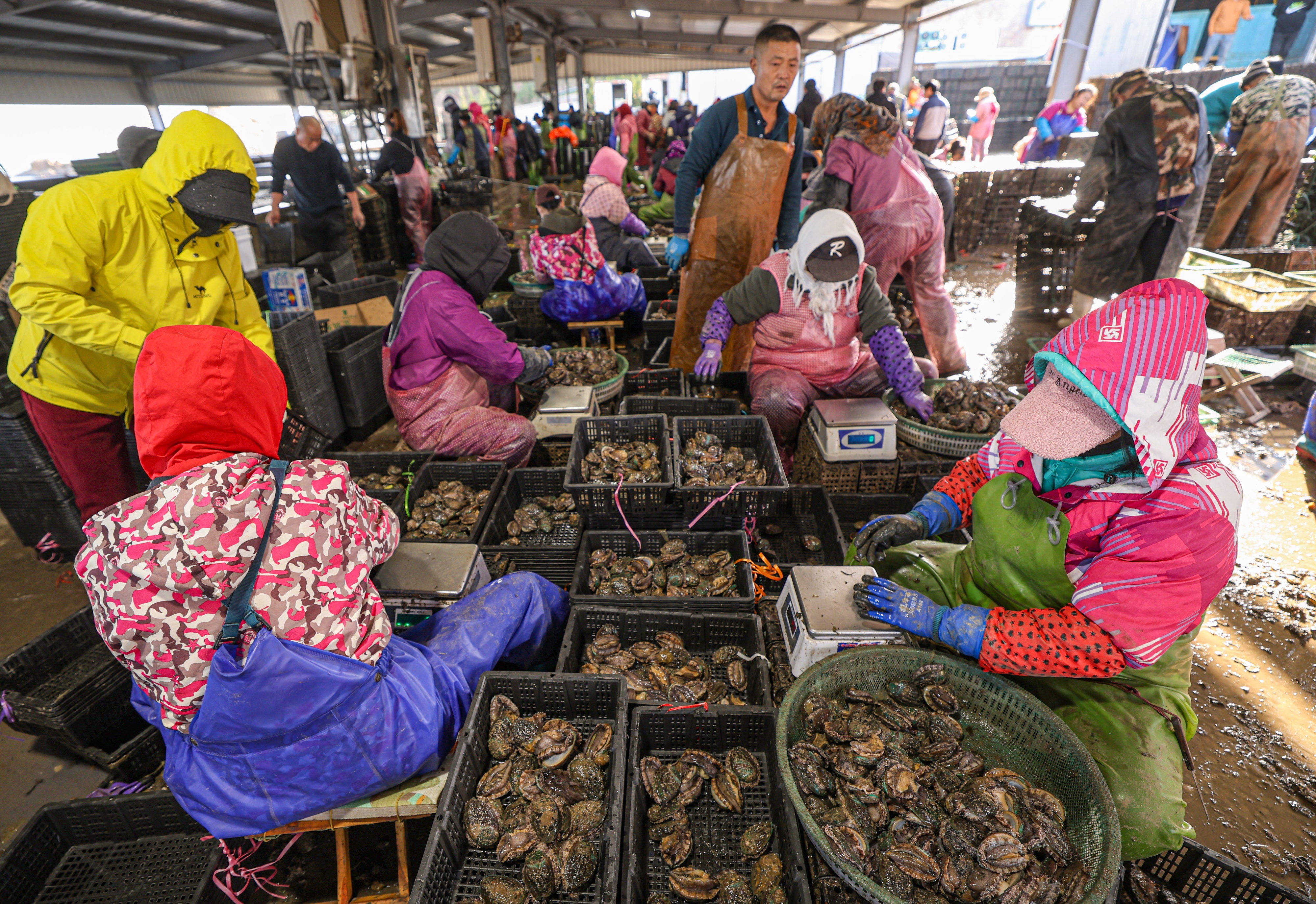 当下,在荣成市俚岛镇、寻山街道等地沿海养殖区,当地鲍鱼养殖户们忙着收获、分拣、加工鲍鱼。