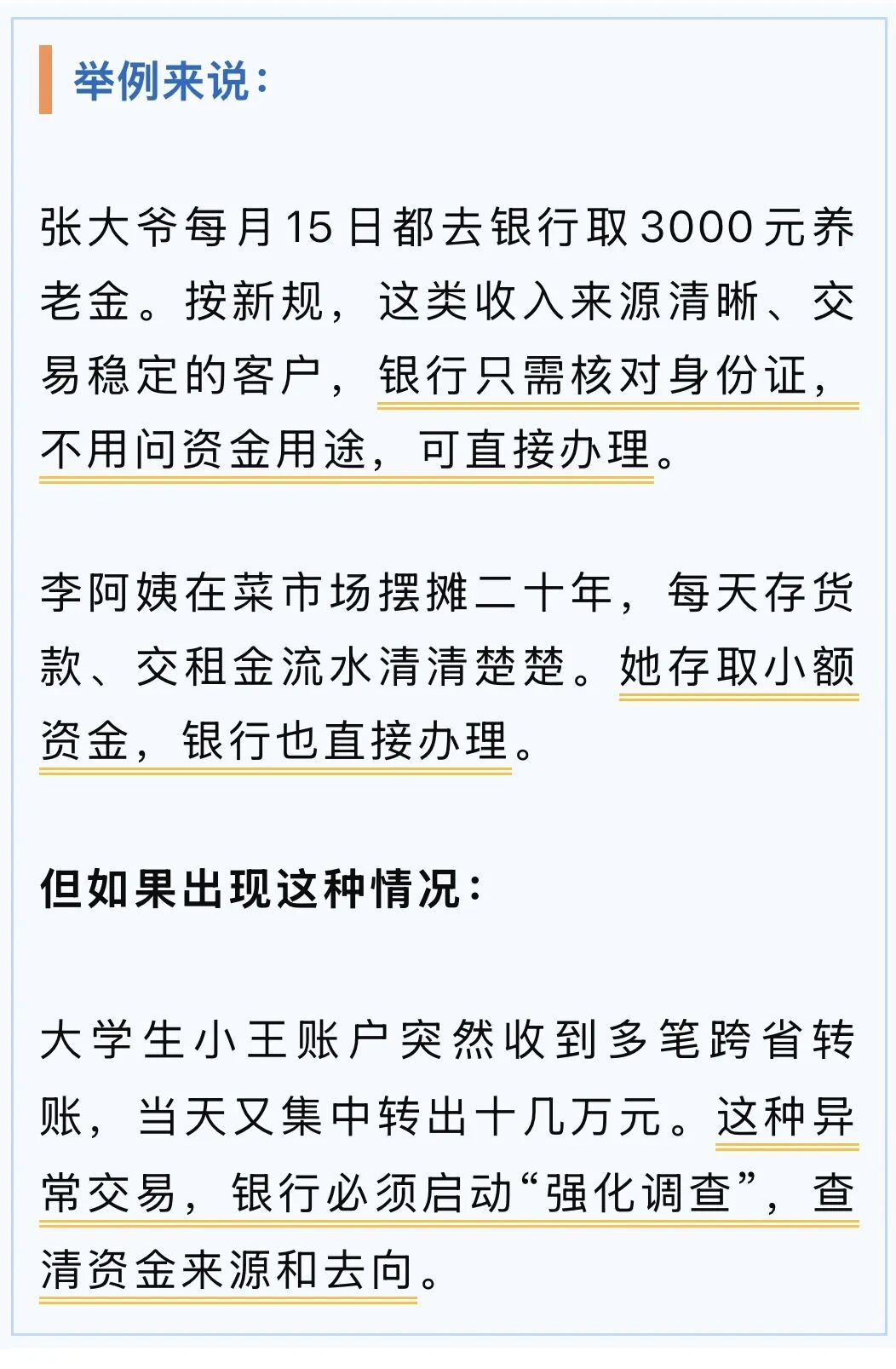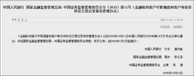 11月28日,中国人民银行、国家金融监督管理总局、中国证监会联合发布《金融机构客户尽职调查和客户身份资料及交易记录保存管理办法》。简单来说,这份新规就是银行不再“一刀切”地询问所有人,而是根据你的风险状况来决定要不要多问几句。