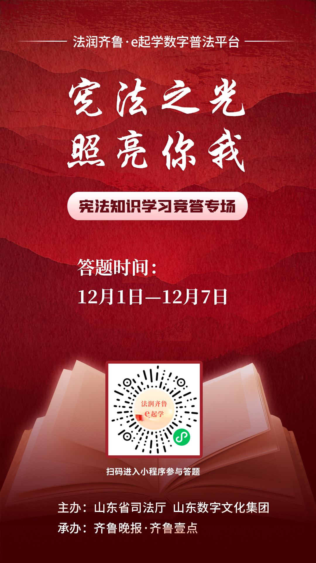 法治兴则国兴,宪法明则民安。12月4日是第十个国家宪法日,为弘扬宪法精神,增强全民宪法意识,即日起,由山东省司法厅、山东数字文化集团主办,齐鲁晚报・齐鲁壹点承办的“法润齐鲁・e起学”数字普法平台推出宪法知识学习竞答专场。