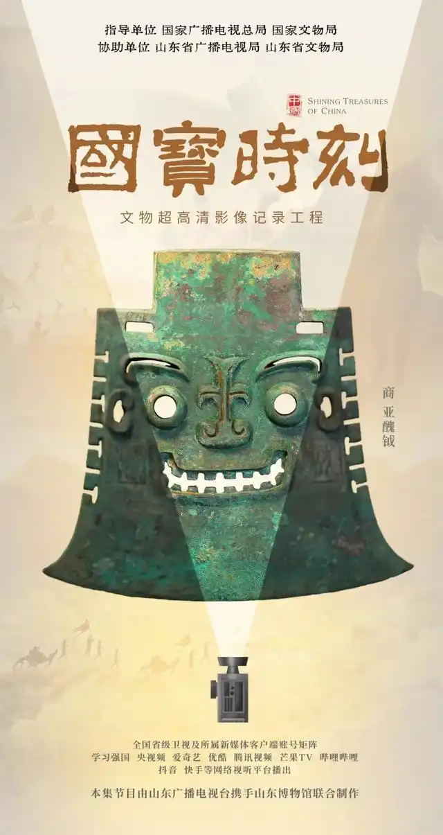 亚醜钺的出现将神秘的亚醜族再次推到大众眼前。无论是带有亚醜铭文的青铜器,还是出土墓葬形制,都证明亚醜族族长或是仅次于商王的方伯一类的人物。作为山东博物馆十大镇馆之宝之一,它兼具威严与神秘的艺术设计,反映了商代青铜工艺的高超水平,更是王权、神权与军事权力的多重象征。通过这些来自山东的文物,《国宝时刻》不仅展现了齐鲁大地深厚的历史文化底蕴,更以独特的视角和创新的叙事手法,让观众得以跨越时空,近距离感受古代文明的魅力。