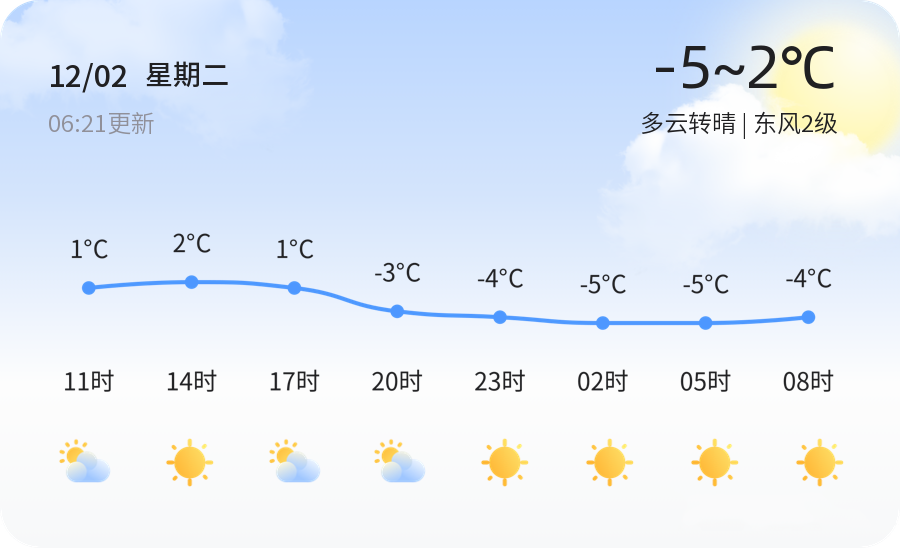 今天是12月2日,星期二,农历十月十三。泰安市今日天气多云转晴,气温介于-5℃至2℃之间,东风2级,空气湿度75%。空气质量状况良好(PM2.5为75)。由于早晨气温较低,市民出行需注意保暖,建议穿厚外套,同时注意路面可能存在的湿滑情况。此外,北风较大,建议减少长时间户外活动,以防受凉。