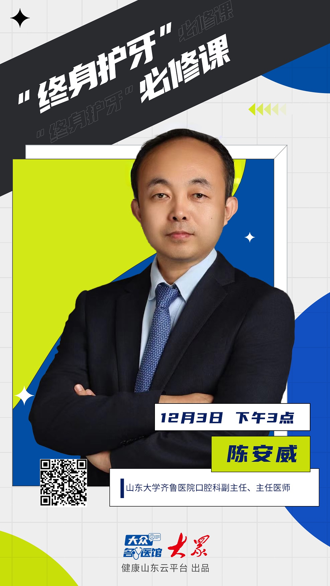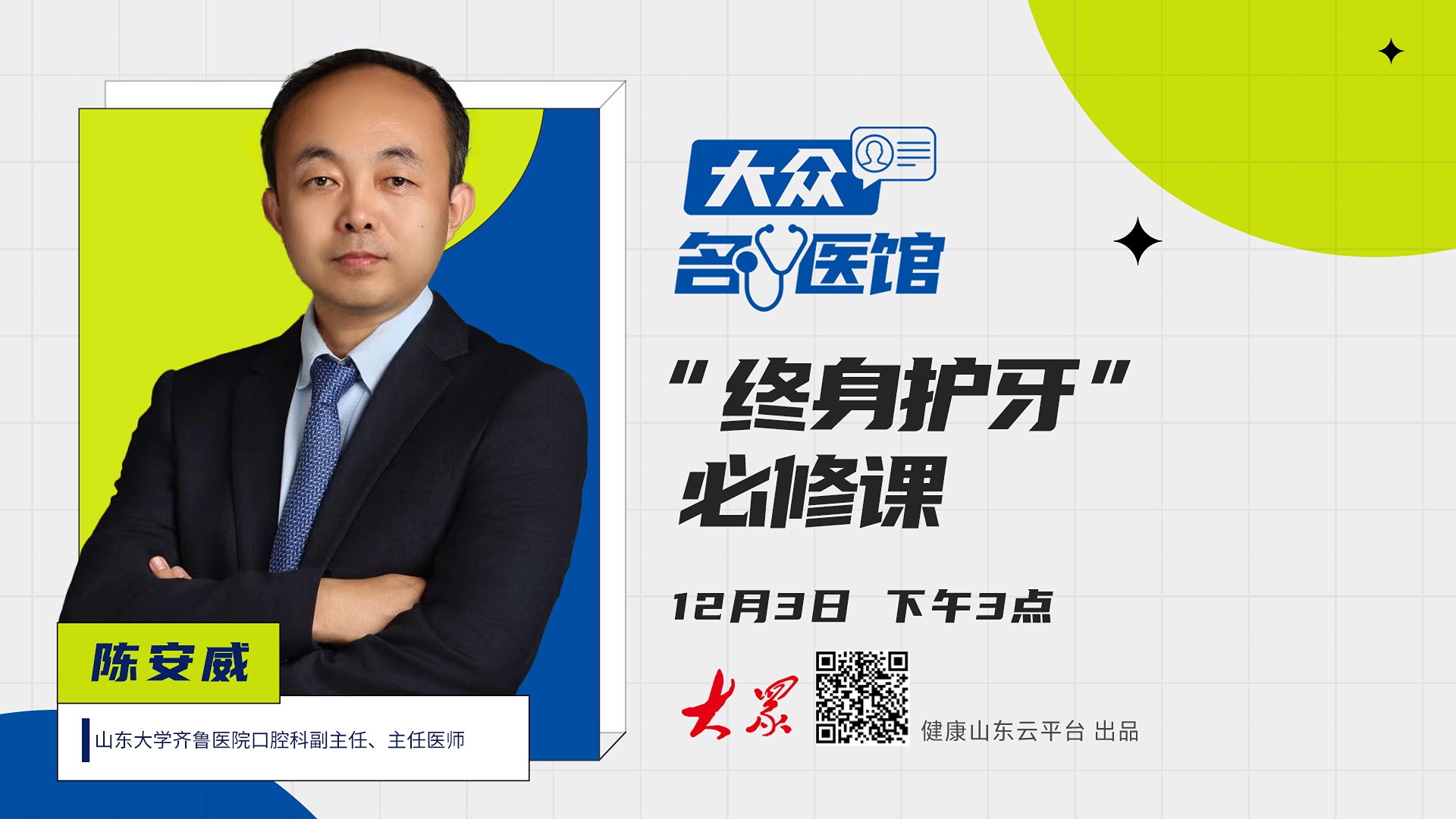 12月3日下午3点,《大众名医馆》邀请到了山东大学齐鲁医院口腔科副主任、主任医师陈安威,为公众带来一堂实用的口腔健康守护课。