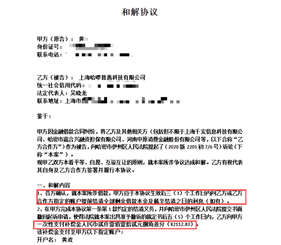 11月27日,在法院的调解下,哈啰方面提出和解方案,以黄先生结清所有欠款及利息并撤诉为前提,同意一次性支付补偿金人民币2112.83元。