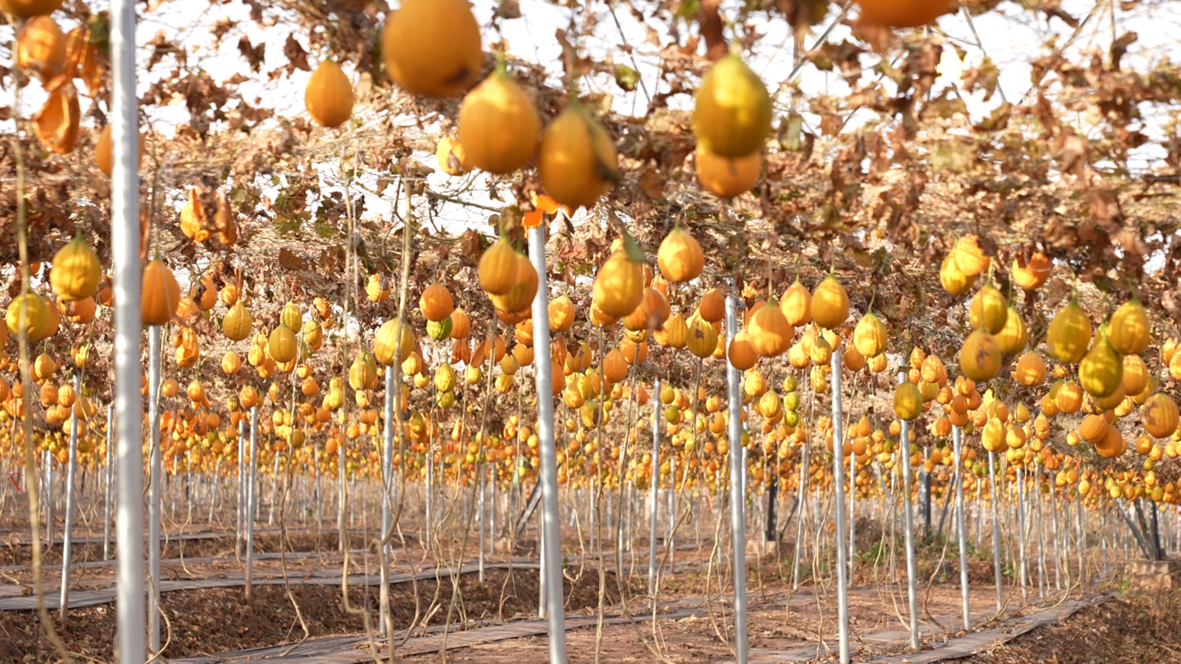 这让村民们津津乐道的“宝贝”,正是学名“瓜蒌”的多年生藤本植物。在郭雪梅剪开的成熟果实中,金黄软糯的果肉裹着油润发亮的籽粒,看似寻常却藏着“全身是宝”的奥秘——籽可作保健食品,口感香醇回甘;果皮是药典收录的常用中药材;就连埋在地下的根茎,待5年后挖掘便是名贵药材“天花粉”。“这可不是咱瞎选的品种,是村‘两委’跑出来、算出来的‘稳当产业’。”王国庆说。