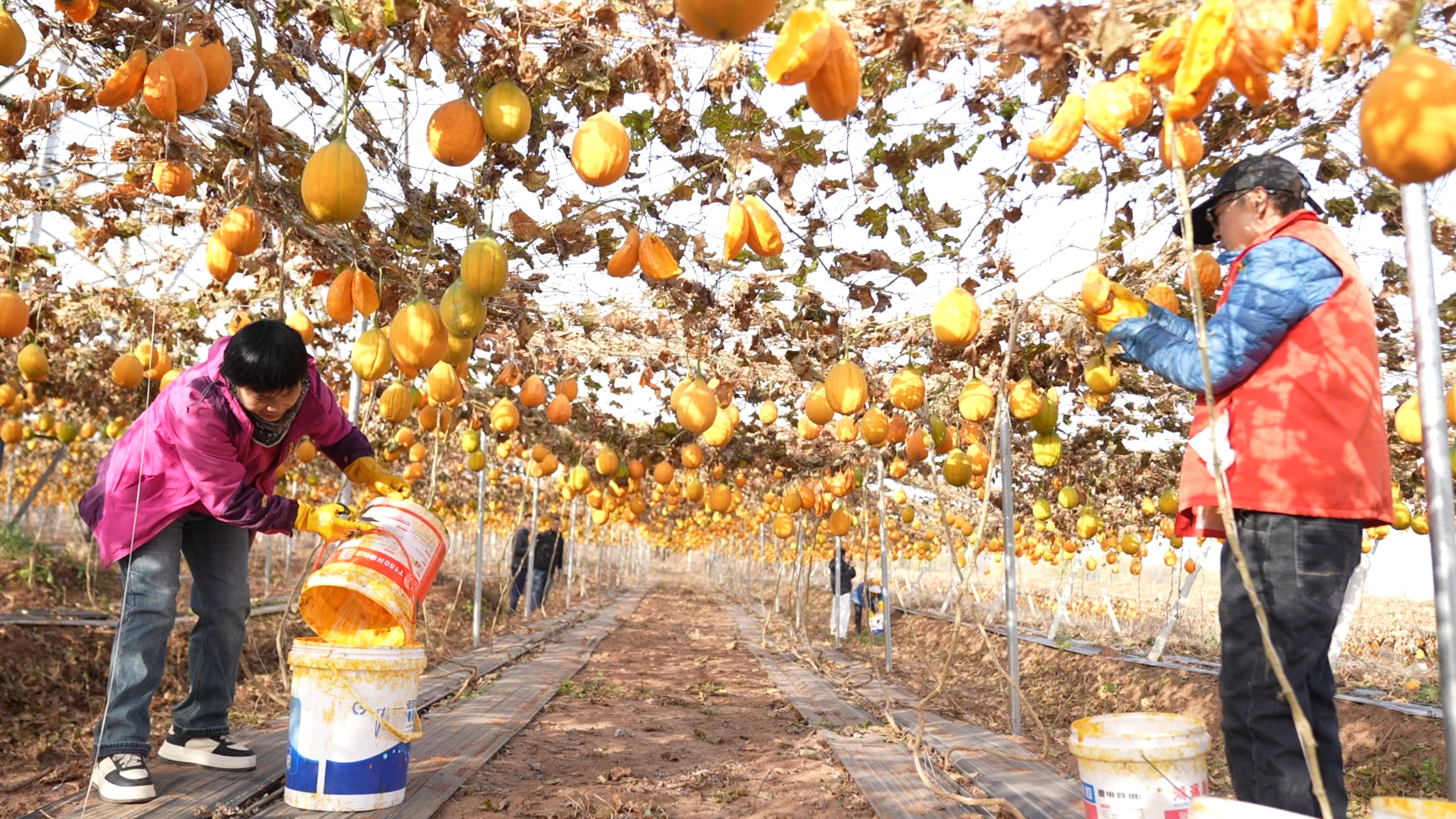 “这金黄的瓜蒌,是我们村56亩地里刨出的‘金疙瘩’!价值16万。”12月1日,淄博高新区中埠镇小王村的瓜蒌种植基地里,沉甸甸的瓜蒌压弯藤蔓,村党支部委员郭雪梅指尖翻飞间,饱满的瓜蒌籽便从果肉中分离出来,丰收的喜悦在她脸上漾开。村党支部书记王国庆正带着“两委”成员分工剪皮、装袋,一派繁忙的丰收图景。