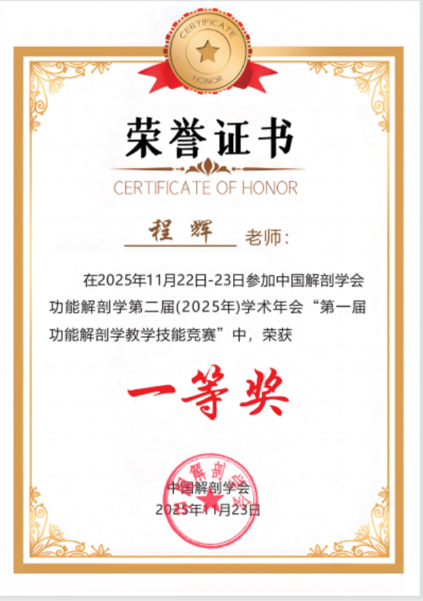 现场竞赛中,程辉老师以《正中神经》为题,凭借清晰教学逻辑、生动表达、精准解剖演示及良好互动,展现学校教师过硬能力与风貌。其设计兼顾知识传授系统性与实践能力培养,融入价值引领,获专家高度认可,终以第一名夺魁。