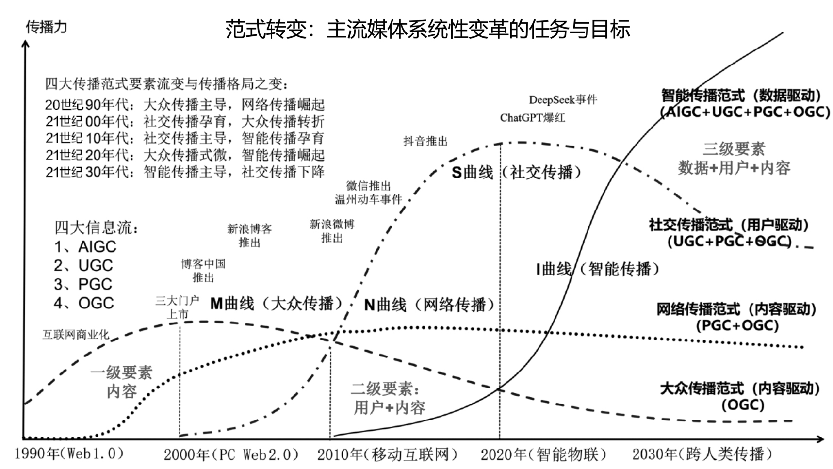 智能传播范式自2010年起步,在2020年后显著上升,其技术周期曲线斜率远超其他三大范式。该范式以2022年ChatGPT爆发式崛起为节点,进入加速扩张期,预计到2030年,其传播力将达到峰值。在这一过程中,数据逐渐成为智能传播时代的核心资产,主流媒体的系统性变革需要突破当前的数据困境,将数据资源与技术创新结合,嵌入内容生产、分发与反馈的全链路中,从而实现智能传播范式下实质性的跃迁。