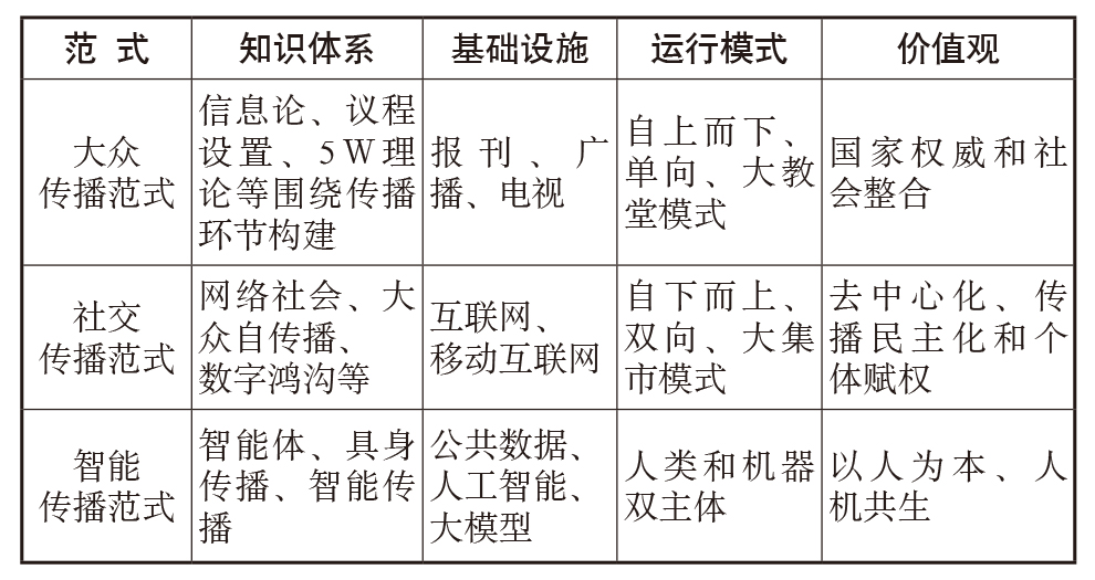 本文旨在通过对大众传播范式、社交传播范式和智能传播范式进行系统分析和比较,梳理三者在基本概念、知识体系、基础设施、运行模式、价值观方面的内容,从而深化对传播范式演变的理解。虽然作为四大传播范式之一的网络传播范式也存在一定程度的范式转变,但其更多表现为传播形态上的差异,本质与大众传播相近,依然是内容驱动。兴起于20世纪90年代的网络传播(Web1.0),正是大众传播的巅峰时刻,还未在当时实质性冲击大众传播的主导权。而进入2000年代后,社交传播范式开始崛起,网络传播也未能真正形成稳定的传播主导权。因此,为便于分析并更好地把握关键因素与发展趋势,本文重点以大众传播、社交传播和智能传播三种传播范式的比较为主线。当然,在某些分析场景中,仍需保留对网络传播范式的关注,因为网络传播至今仍具有强大生命力——全球数亿网站依然构成互联网信息的基本盘。