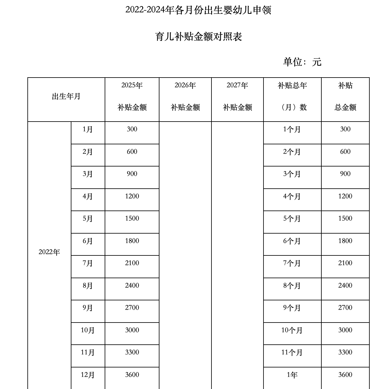 (2)对于2025年1月1日前出生且未满3周岁的婴幼儿,可按应补贴月份折算计发补贴金额。先申领整年补贴,再申领剩余月份补贴。具体算法见下表。
