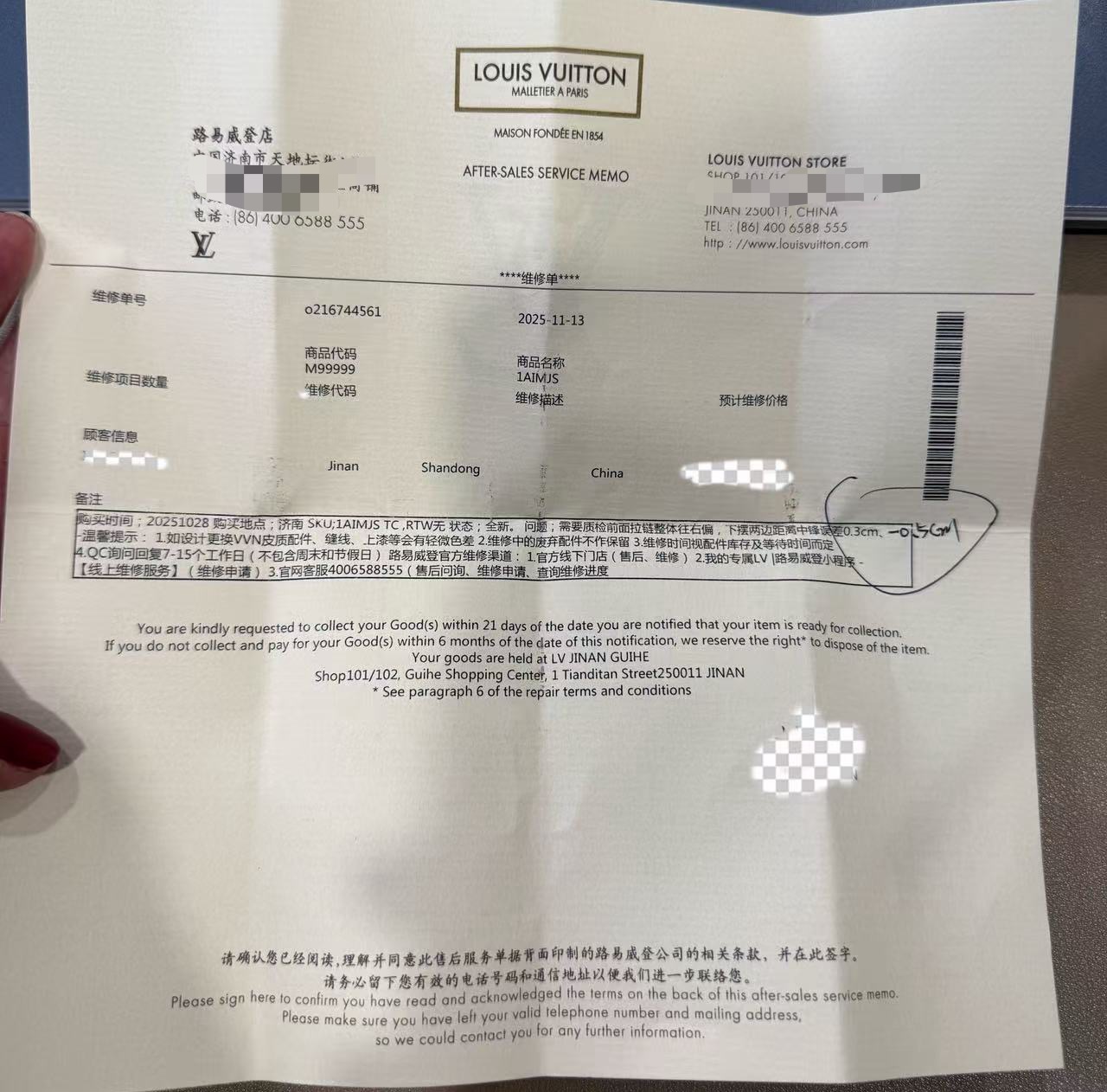 侯女士告诉齐鲁晚报·齐鲁壹点记者,11月12日,她的家人首次穿着该外套出门时,被旁人提醒“衣襟不对称、拉链整体向右偏移”。侯女士认为这影响了穿着效果,属于质量问题。于是次日,她带着衣服和购买凭证,回到该LV专柜要求换货。专柜工作人员接收了外套,并开具维修登记单,告知她需将商品寄回总部进行鉴定。