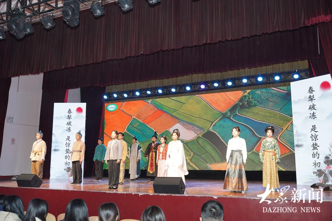当日下午,“农事诗会”在学校大礼堂举行。诗会以“二十四节气”为脉络,紧扣不违农时、人与自然和谐共处的主题,通过诗词吟诵、节气情景剧、古典歌舞等丰富多彩的表演形式,生动演绎时序流转中春生、夏长、秋收、冬藏的农耕智慧与生命循环,让现场观众在唯美诗意的田园画卷中,沉浸式感受先民“天人合一”的生存智慧与农耕文明的深厚底蕴。