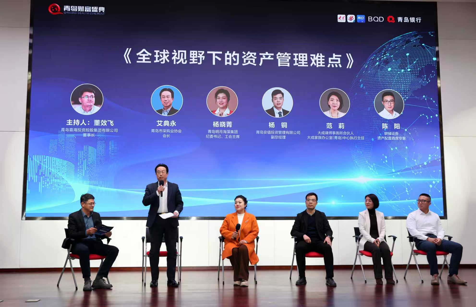 活动现场,青岛喜海投资控股集团有限公司董事长董效飞作为圆桌对话主持人,与青岛市采购业协会会长艾典永,青岛明月海藻集团纪委书记、工会主席杨晓菁,青岛安值投资管理有限公司副总经理杨铜,大成律师事务所合伙人、大成家族办公室(青岛)中心执行主任范莉,联储证券资产配置首席专家陈阳,共同围绕“全球视野下的资产管理难点”这一主题进行了深入探讨。