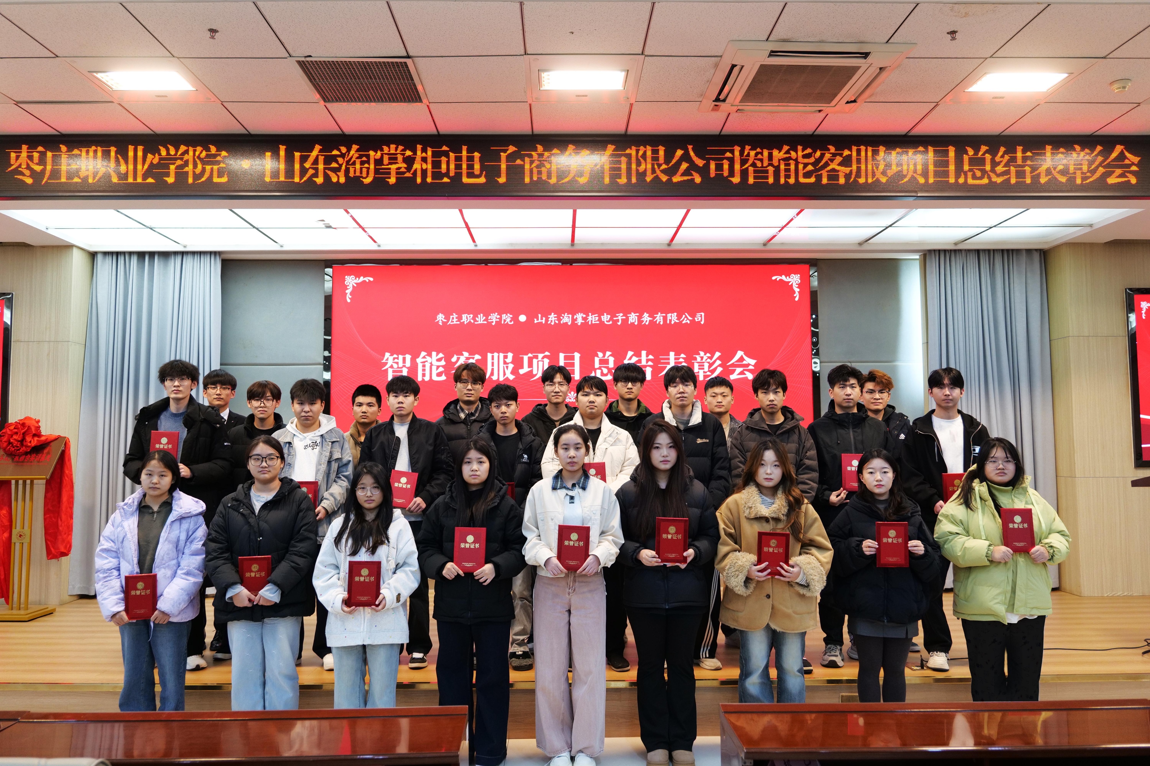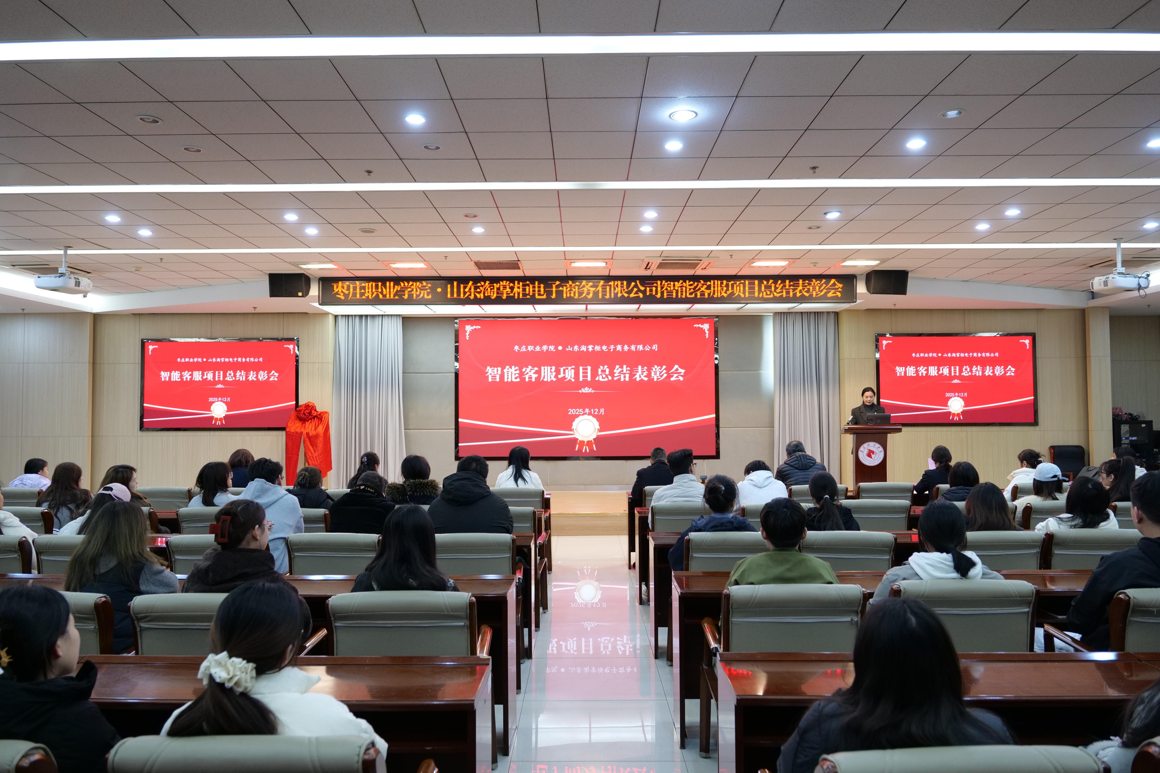 12月1日,枣庄职业学院举行智能客服项目总结表彰会。枣庄职业学院党委委员、宣传部部长、统战部部长郝艺,山东淘掌柜电子商务有限公司副总经理蔡莉,学院校企合作与科研处、经济与信息技术系主要负责人,校企双方指导老师代表及参与项目的150余名学生共同参会。