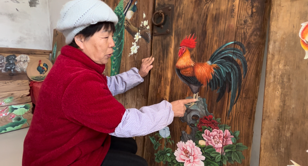 “原来旧门板也能变成艺术品,还有人喜欢!”这次意外的认可,让李玉莲“扎”进了木板画的创作里,一只只威风凛凛的大公鸡从她的养鸡场“跳”到了门板上。