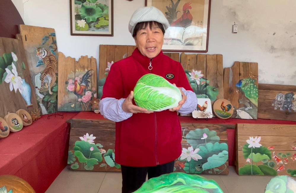 大约十平方的画室里,李玉莲的画作题材都围着“乡土”“接地气”打转转:昂着冠子打鸣的大公鸡、喜庆的年画“莲年有鱼”、传统的十二生肖、大白菜等等。她的“画纸”,也从门板扩展到石头、葫芦、匣钵,李玉莲说,不管什么材料,只要能留住乡土的味道,就能画。