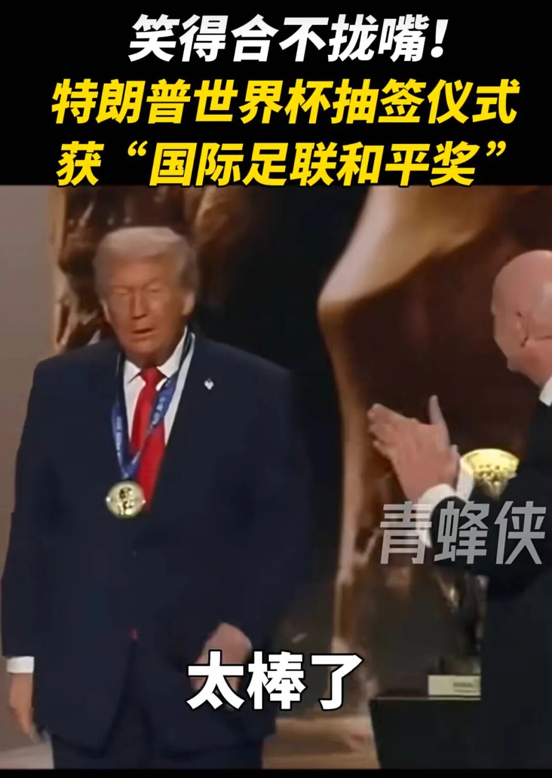 喜获“国际足联和平奖” 特朗普给自己戴奖牌,称是人生中至高的荣誉之一