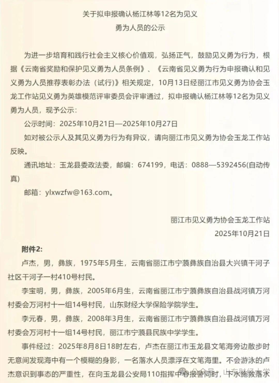 事后,玉龙县政府得知这一情况,立即为他申报见义勇为英雄模范荣誉表彰。