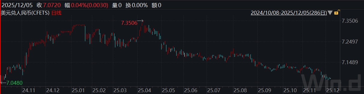 近期,人民币对美元汇率持续走强,时隔一年多首次逼近7.0重要关口。Wind数据显示,12月6日,在岸人民币兑美元北京时间03:00收报7.0720元,较周四夜盘收盘跌10点。12月3日盘中,人民币对美元汇率最高触及7.0613,创下2024年10月以来新高。