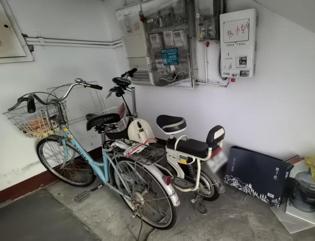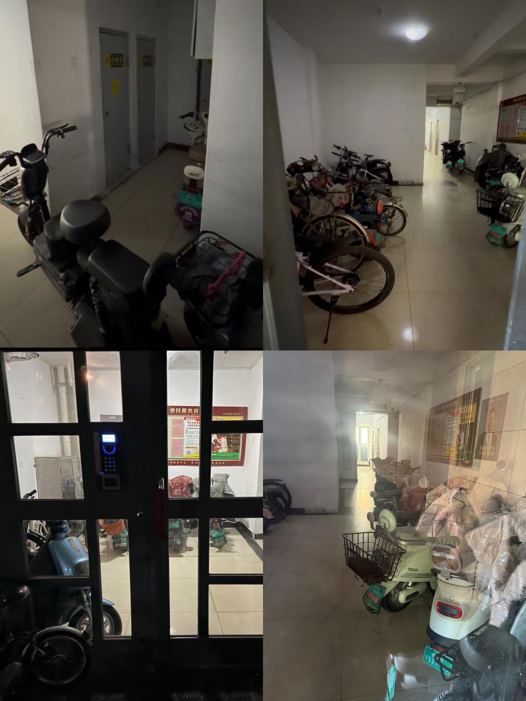 生资小区3号楼1单元一层楼梯下停放着一辆电动车和一辆自行车。