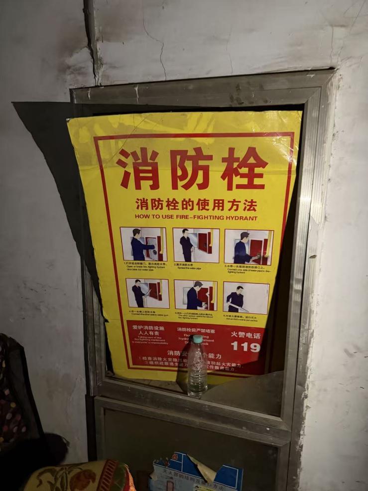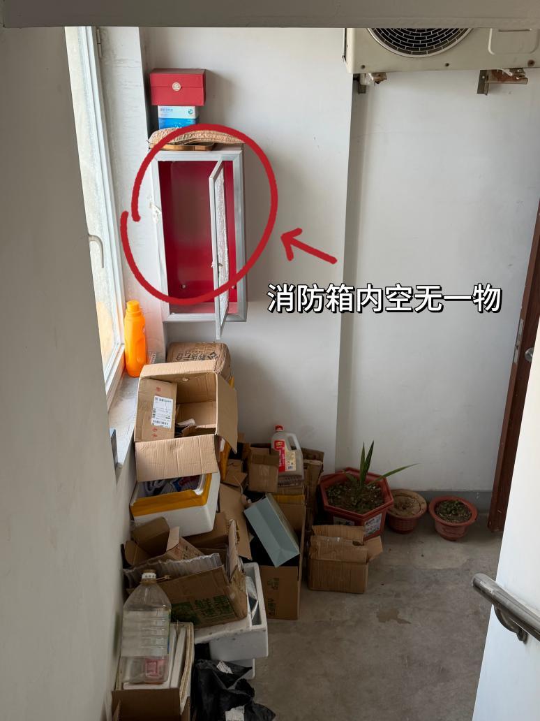 青山新村回迁楼1楼消防箱破损,里面的灭火器缺失,也未见消防设施检查记录表。