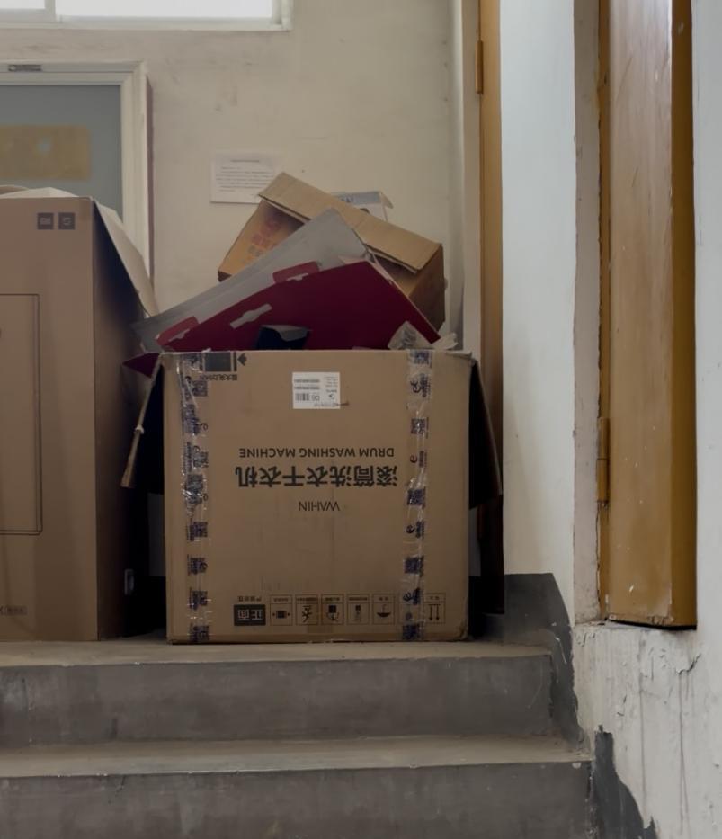 大展城市花园楼梯拐角处纸箱等杂物堆积,挡住了后方的消防设施。
