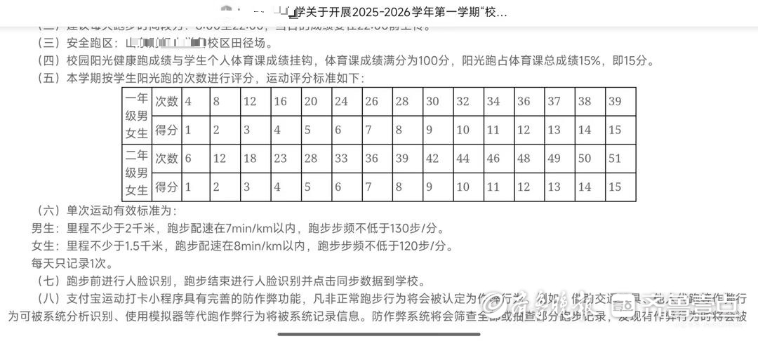 山东一高校发布的通知指出,校园跑成绩与学生个人体育课成绩挂钩。