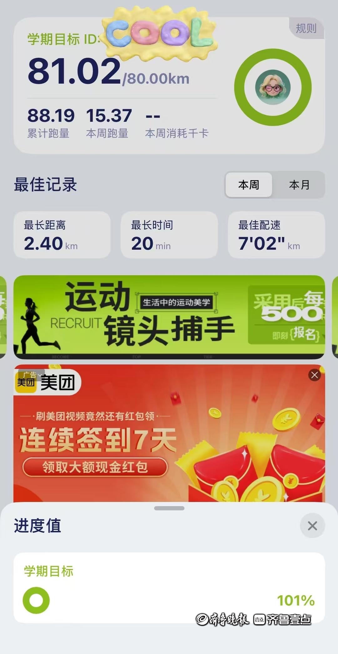 “有压力”是学生们对校园跑最常说的评价,“想拿满分,得连续跑70多天。”潍坊一高校学生王浩(化名)很无奈,总里程达标线让她焦虑,“看到舍友跑完210km时,我心里特别慌,怕分数落后。”
