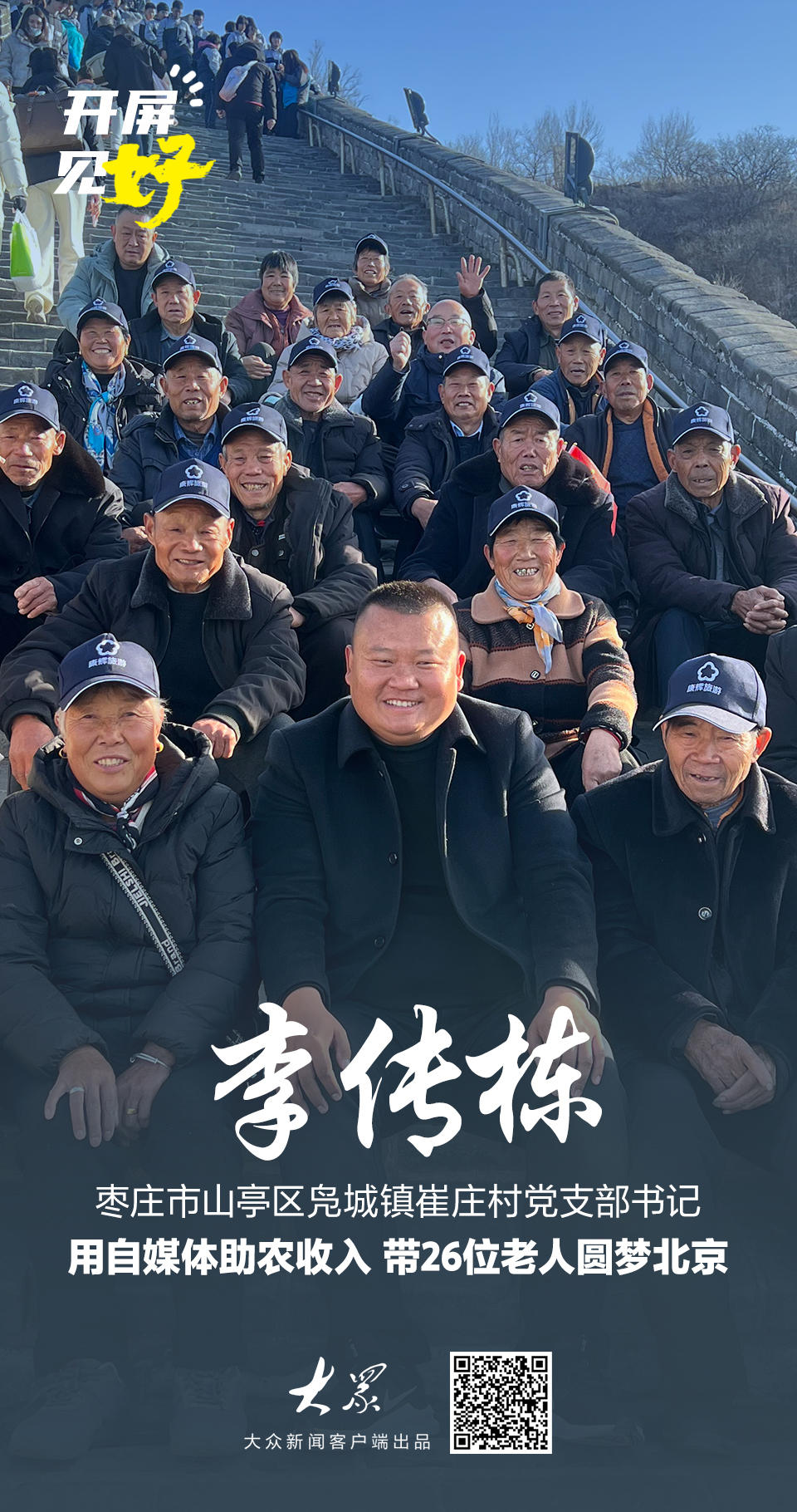 不久前,这位一辈子没出过远门的老人,跟着村里25位同伴,在村党支部书记李传栋的带领下,登上了天安门城楼、爬了长城——而这趟旅程的费用,来自李传栋用自媒体助农赚来的2万多元。