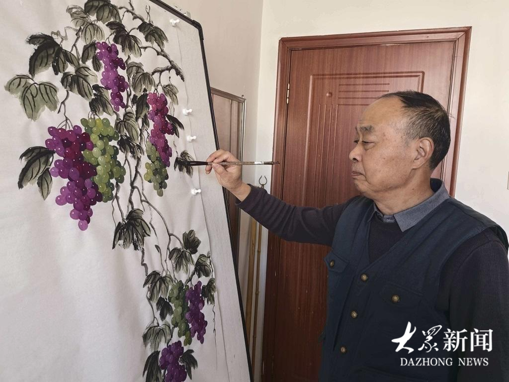 在钢山街道龙山社区退休医生宋培育正在画画。
