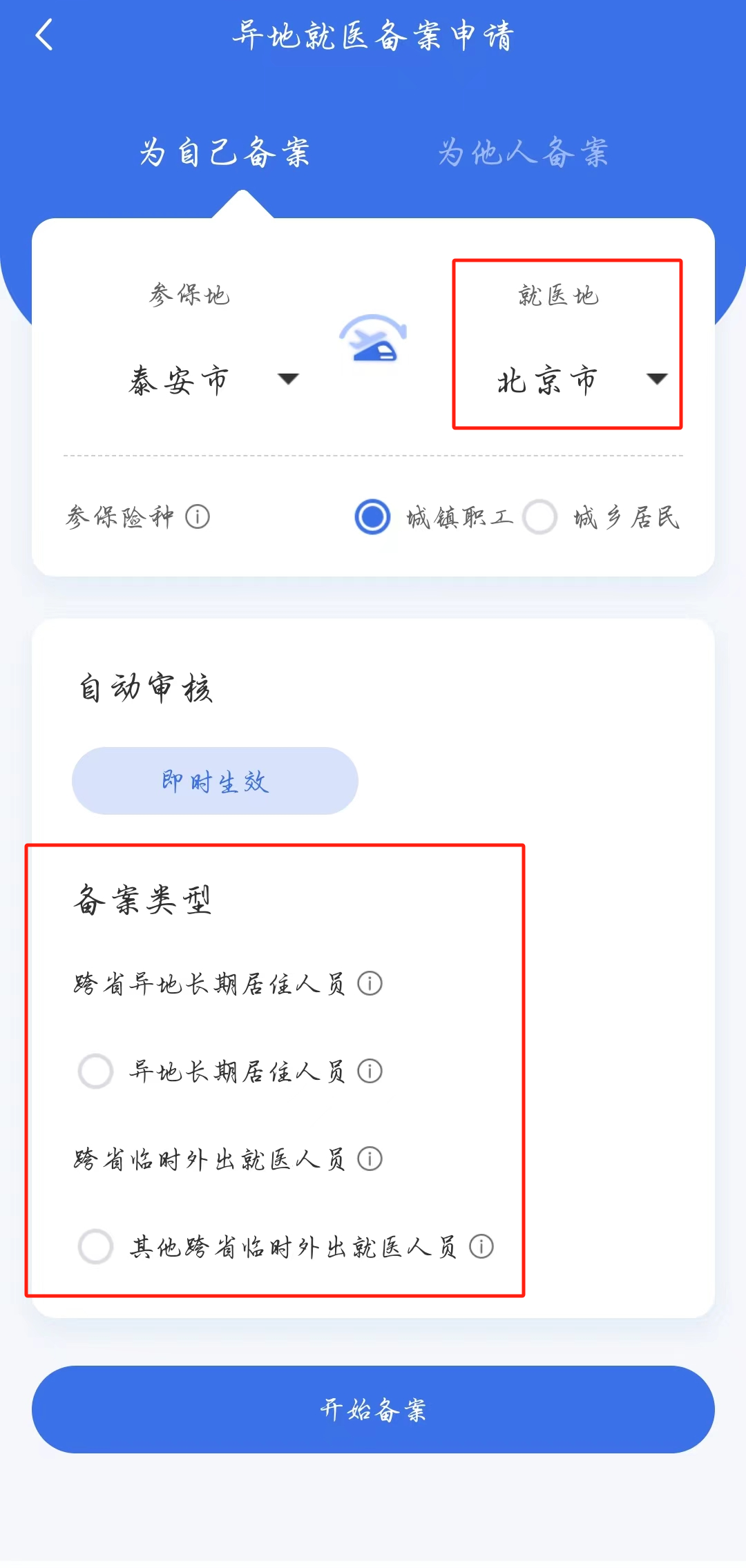 二、为自己备案:根据您就医的城市,在“就医地”选择对应的地市或直辖市,备案类型选择“跨省异地长期居住人员”或“跨省临时外出就医人员”,选择完后点击“开始备案”进入下一页面。