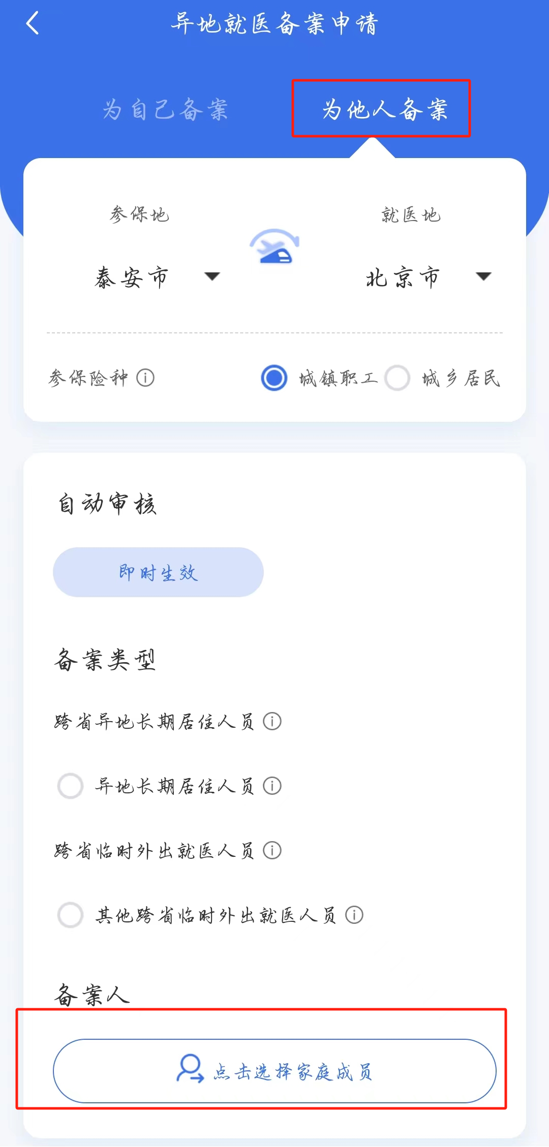 三、为他人备案:根据您所需要帮助的备案人实际情况,选择“参保地”、“就医地”、“参保险种”、“备案类型”、“备案人”后,点击开始按钮。(备案人通过”选择家庭成员‘’进行添加,如果未绑定家庭成员,可点击“添加家庭成员”,选择合适的方式进行绑定即可)