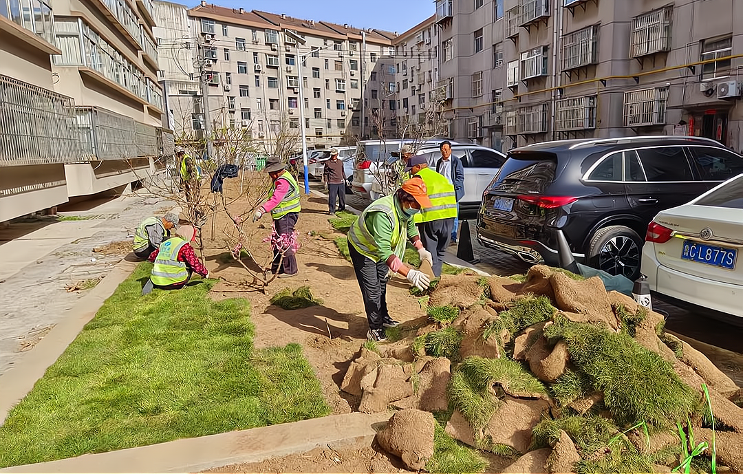 在随后的采访中,记者多次跟随工作人员前往绿化现场。他们不畏艰辛,在原本裸露的土地上补植草坪、种植海棠树等绿植。颜山社区仲岭小区的居民张纪义告诉记者:“以前小区裸露土地多,刮风扬尘、下雨泥泞,现在补植了草坪、种了海棠树,出门跟逛公园似的。”绿色,逐渐成为了村居环境的主色调。