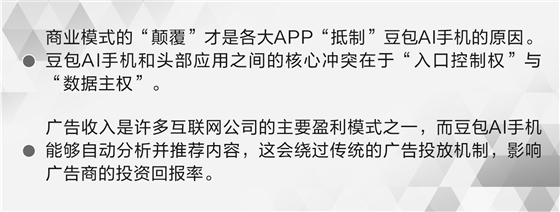余丰慧也认为,广告收入是许多互联网公司的主要盈利模式之一,而豆包AI手机能够自动分析并推荐内容,这会绕过传统的广告投放机制,影响广告商的投资回报率,这也是互联网大厂APP“抵制”豆包AI手机的核心原因。