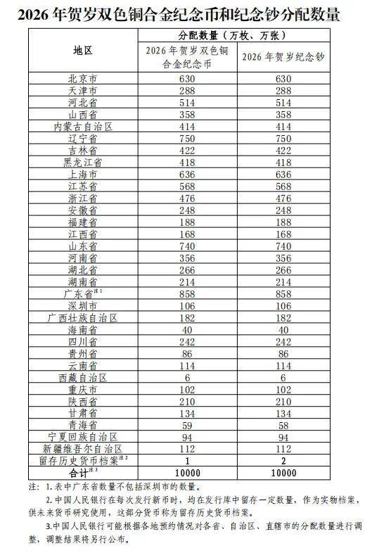 各省、自治区、直辖市双色铜合金纪念币和纪念钞分配数量如下: