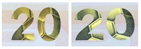 位于票面正面。改变观察角度,面额数字“20”的颜色在金色和绿色之间变化,并可见圆形光环效果。防伪特征效果见图8。