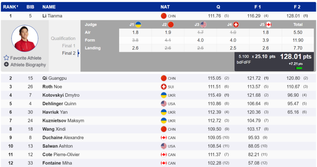 决赛第一轮过后,王心迪遭到淘汰,第二轮中,中国选手李天马跳出128.01分,夺得金牌,老将齐广璞以120.80分银牌,瑞士选手诺埃·罗特110.67分获得铜牌。