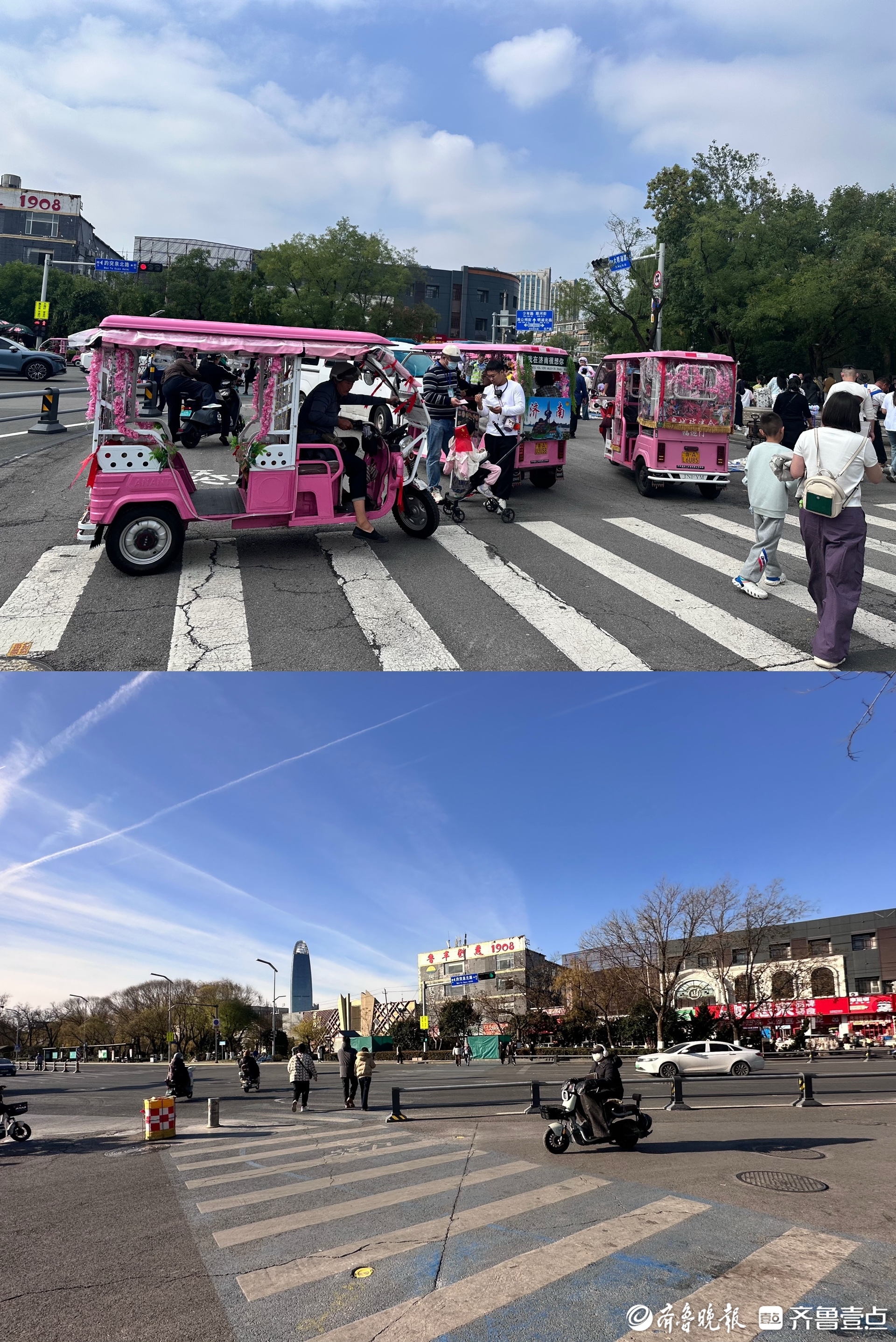 (国庆假期与元旦假期的大明湖西南门前,花车从扎堆揽客到消失不见)