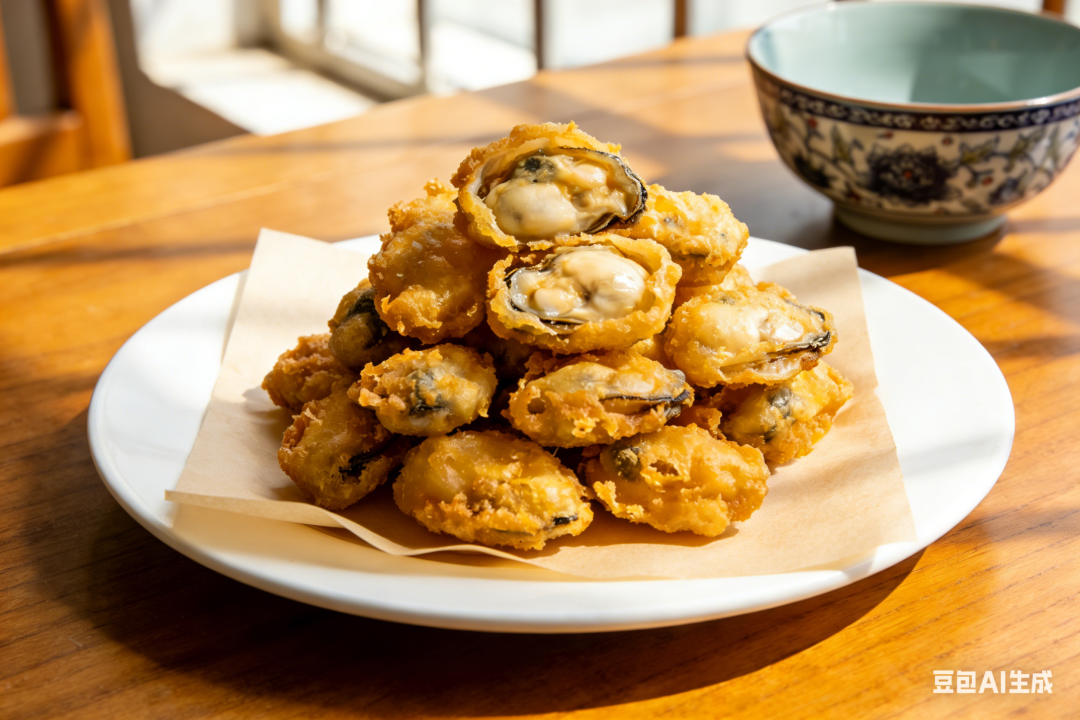 1.将牡蛎肉洗净,用盐、胡椒粉等腌制入味;均匀裹上由面粉和鸡蛋调成的面糊。