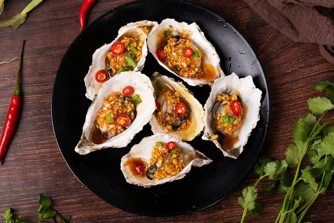 2.将蒜蓉、姜末、酱等佐料放入牡蛎内,直接放到火上烤熟食用。