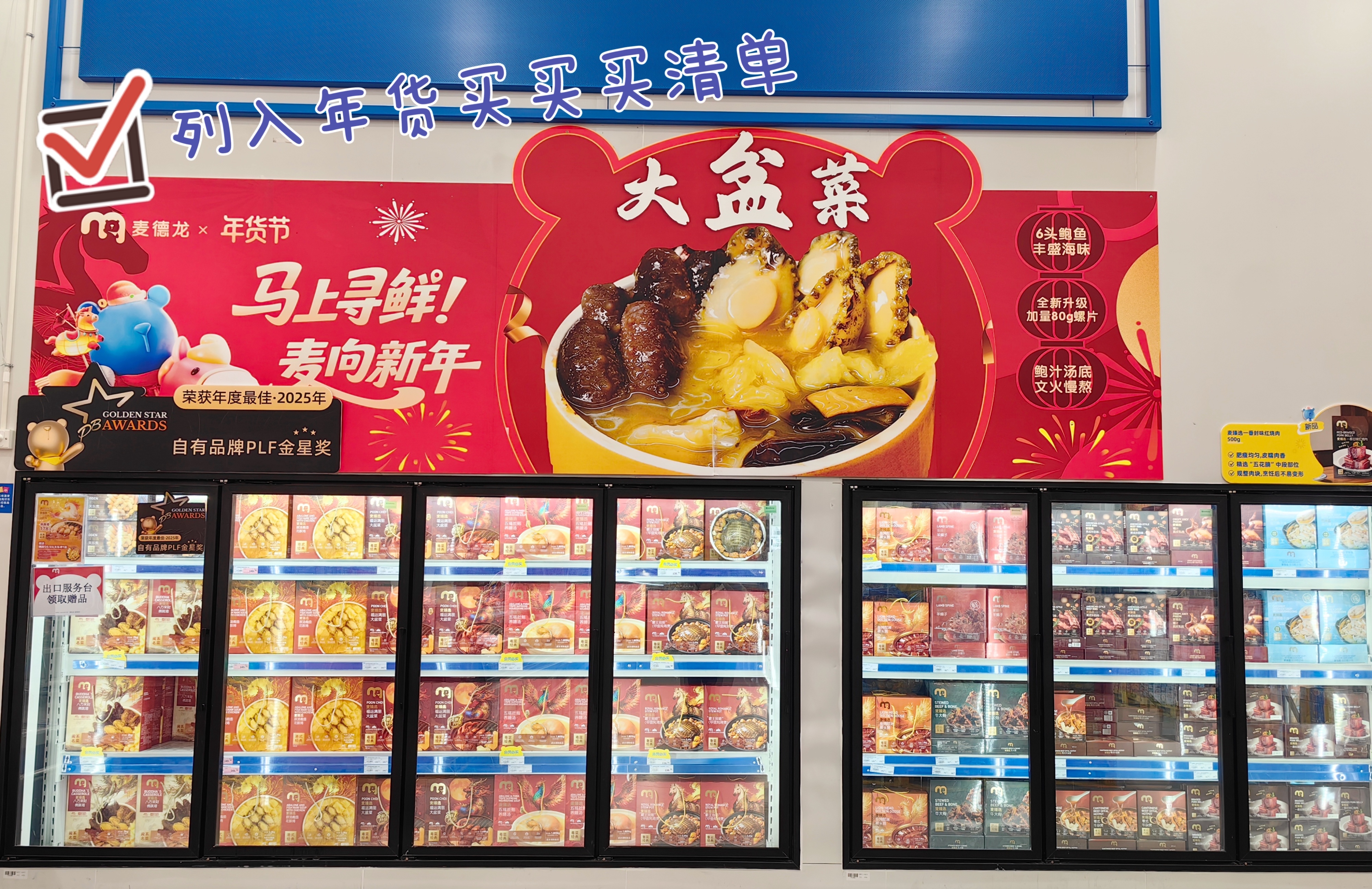针对春节家宴“省时省力又出彩”的需求,麦德龙准备的各类快手年菜也备受青睐。记者在冷冻区看到,有甲鱼炖鸡煲、福运满朋大盆菜、五福肚煲养膳汤等鲁菜、粤菜多款经典菜式礼盒,其中一款麦臻选“八方来财佛跳墙”销量火爆,内含6只鲍鱼、6根海参和100g花胶,鲜味全配齐。“寓意好,叫‘福寿全’,内容也硬核。自己炖太费事,这个加热就能上桌,绝对是宴客的‘镇桌大菜’。”一位年轻顾客这样评价。