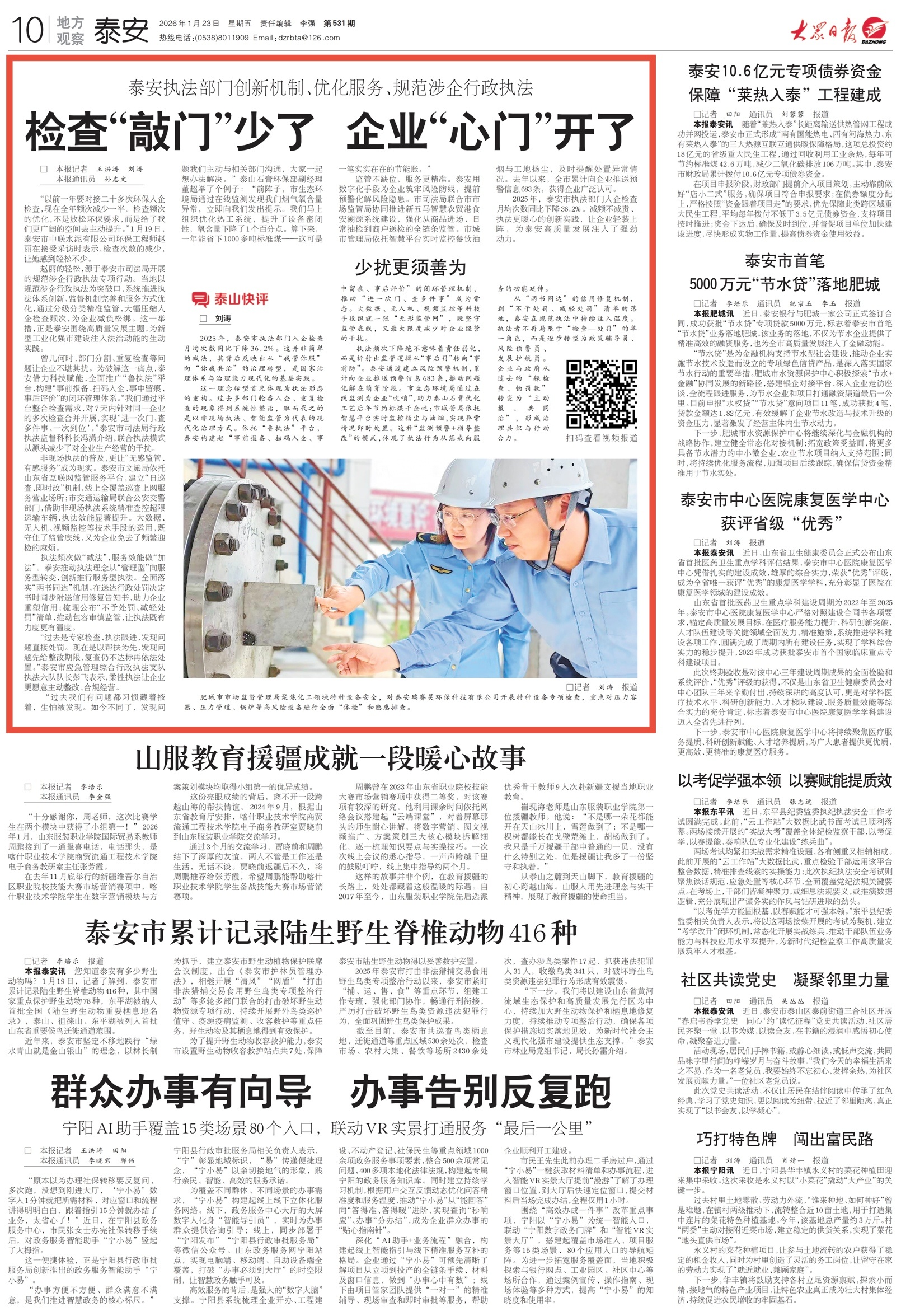 1月23日,大众日报《泰安新闻》推出重磅策划《检查“敲门”少了 企业“心门”开了》,报道泰安执法部门创新机制、优化服务、规范涉企行政执法,让企业轻装上阵,为泰安高质量发展注入了强劲动力。详情请点击这里—