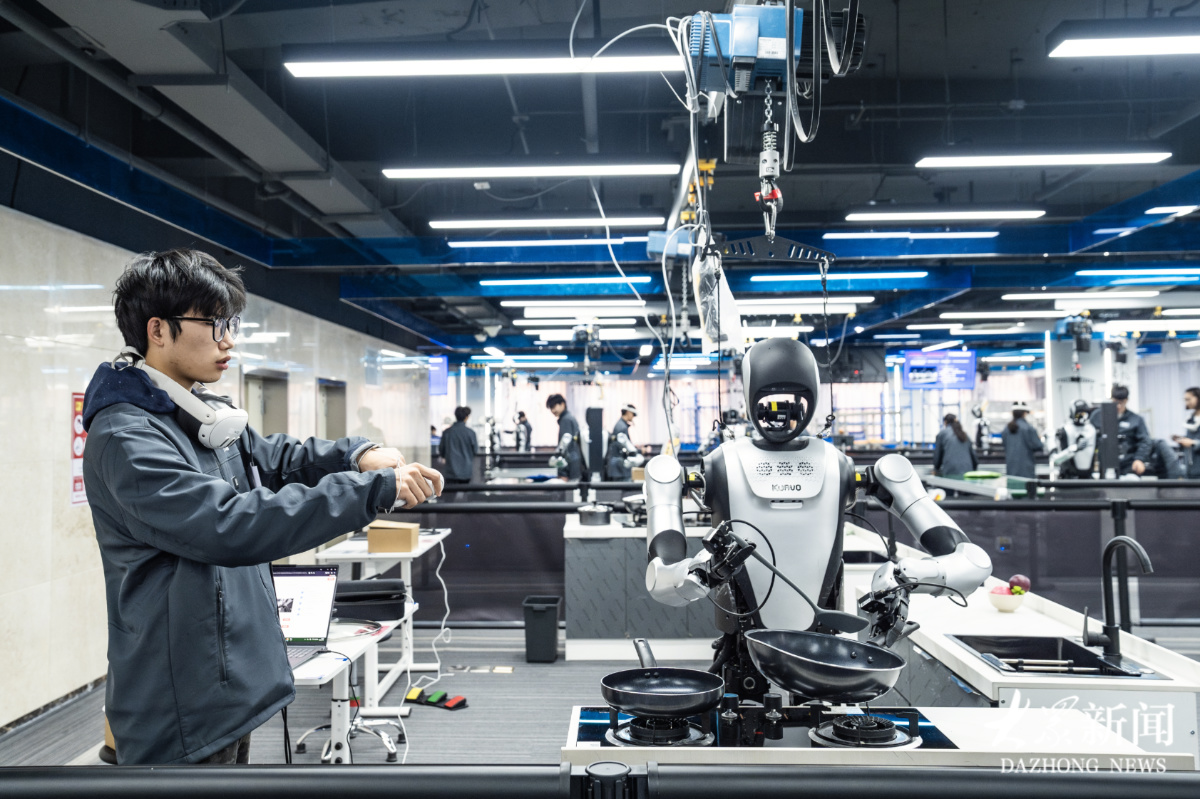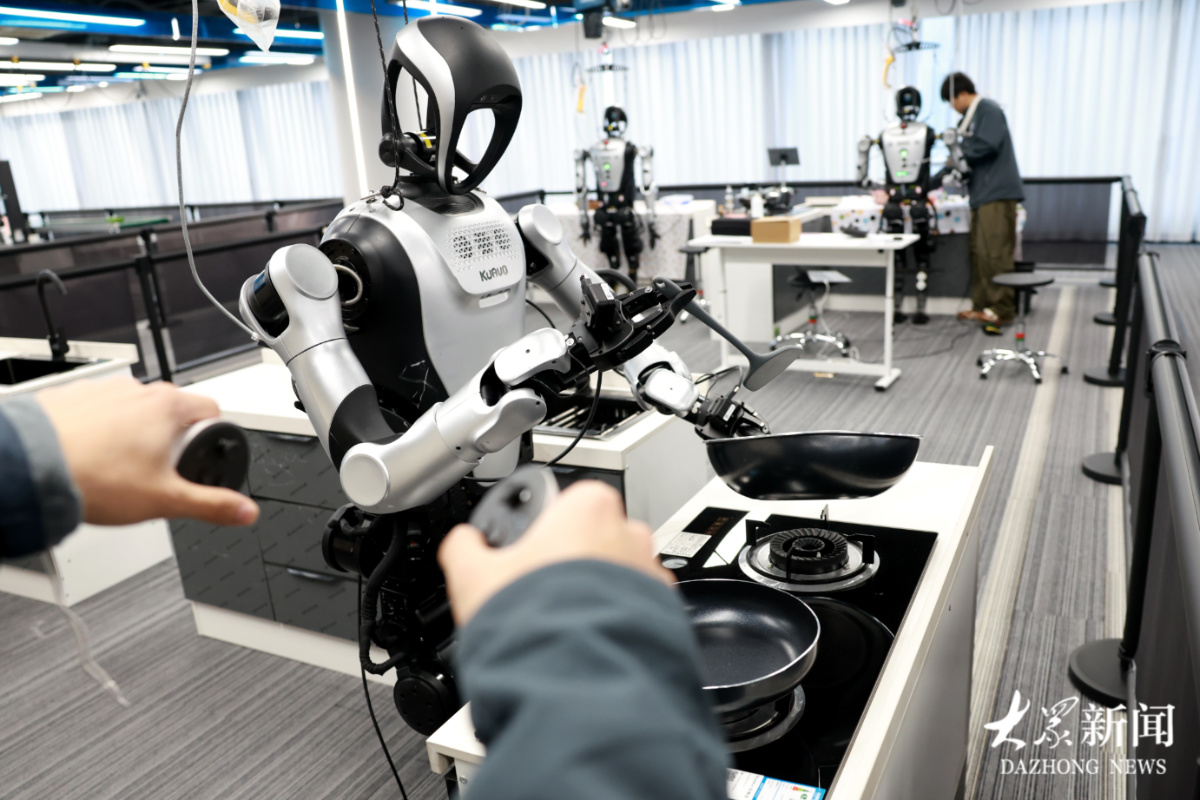 在青岛崂山区的人形机器人数据采集训练场,数据采集员陈云龙正在“教”机器人炒菜。