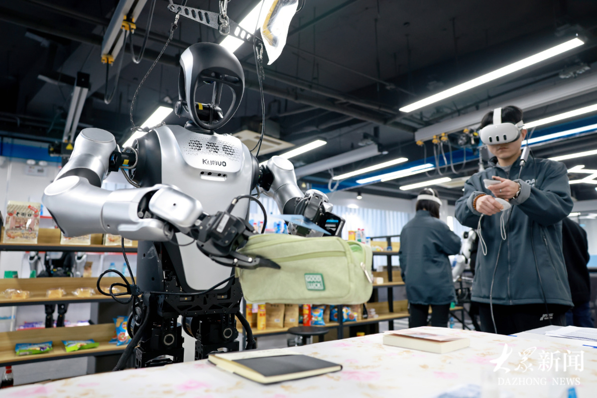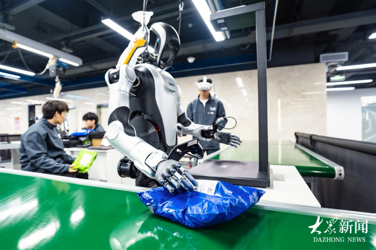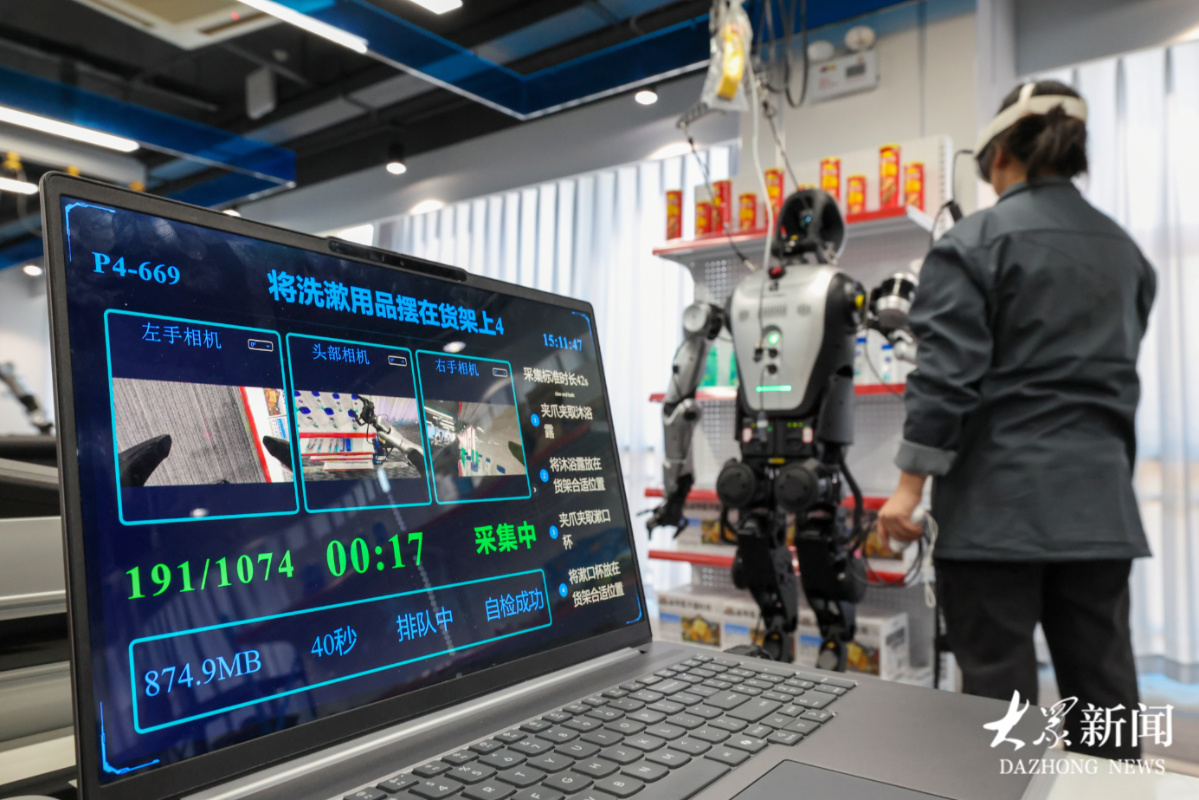 在青岛崂山区的人形机器人数据采集训练场,数十名头戴VR眼镜、手握遥控器的工作人员,正专注地操控人形机器人完成抓取、放置等基础动作。“他们是数据采集员。”数据采集部组长刘文硕向记者介绍。