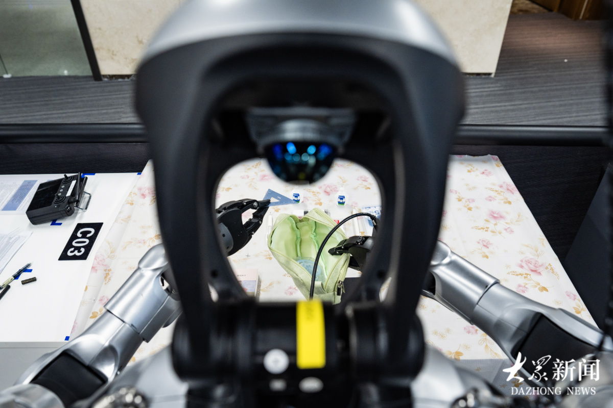 商超场景下,张家铭需要操控机器人将三角板放入文具袋中。